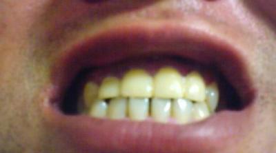 上の前歯4本が差し歯です。もちろん、型を取っての差し歯ですので、幅や長さは昔のままですが、歯の厚みは実際の歯よりも厚いと思います。